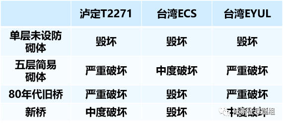 進(jìn)一步對(duì)比三個(gè)地震動(dòng)記錄對(duì)其他典型工程的破壞,可以看出。由于單層未設(shè)防砌體抗震性能太差,三個(gè)地震動(dòng)記錄都會(huì)導(dǎo)致毀壞的結(jié)果。而對(duì)于五層簡(jiǎn)易砌體,由于其周期較短,而花蓮地震ECS地震動(dòng)的短周期段不是很強(qiáng),所以破壞程度相對(duì)其他兩個(gè)地震動(dòng)要輕一些。而由于花蓮地震ECS地震動(dòng)的中長(zhǎng)周期段非常強(qiáng),因此無(wú)論是新舊橋梁,都會(huì)導(dǎo)致嚴(yán)重破壞。這也與這次臺(tái)灣花蓮地震后大量橋梁嚴(yán)重破壞的震害結(jié)論是一致的。