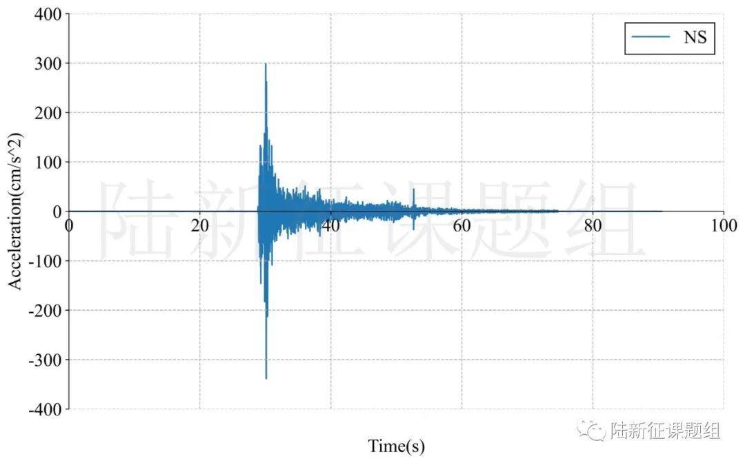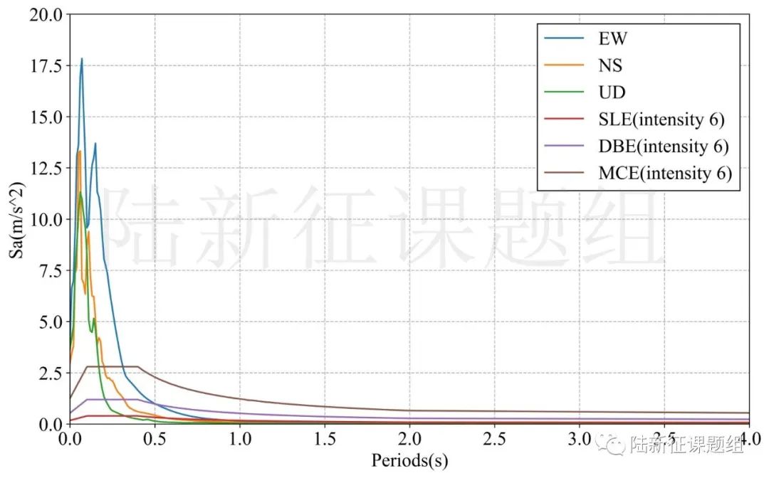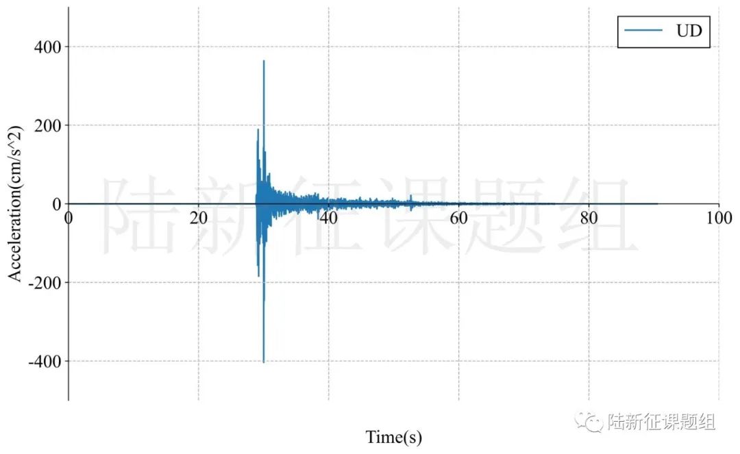 HE.A0065典型臺站位置北緯38.4度,東經(jīng)113.73度,記錄到水平向地震動峰值加速度為648cm/s/s,豎直向地震動峰值加速度為403cm/s/s。該地震動及反應(yīng)譜如圖1、圖2所示。