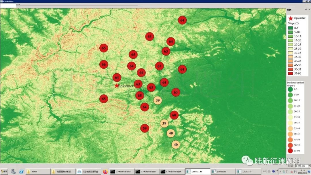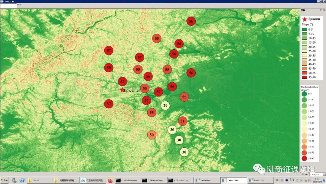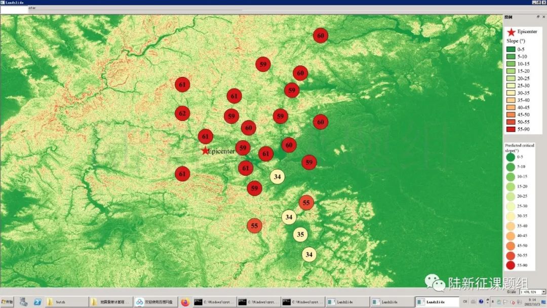 根據(jù)當(dāng)?shù)氐匦螖?shù)據(jù)、巖性數(shù)據(jù)和實(shí)測地面運(yùn)動記錄,可以計(jì)算得到不同滑坡體飽和比例下的滑坡分布,如圖5所示。其中,底圖為當(dāng)?shù)仄露确植紙D,每個(gè)圓圈代表每個(gè)臺站的計(jì)算結(jié)果,圓圈中的數(shù)字代表發(fā)生滑坡的臨界坡度,臺站附近坡度大于該數(shù)值的地方滑坡發(fā)生概率高。
