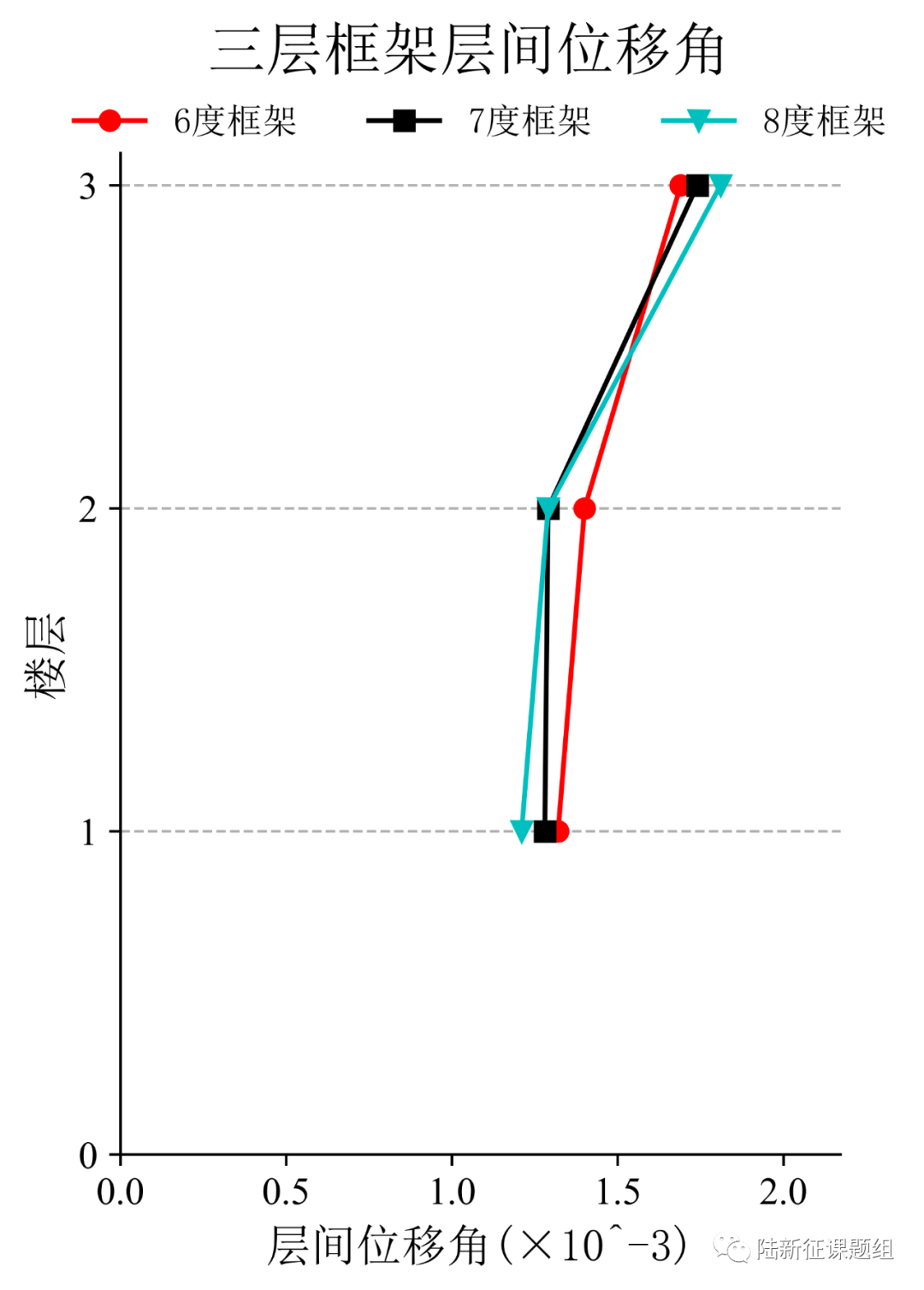 將典型臺站記錄輸入立面布置如圖6(a)所示的6度、7度和8度設(shè)防的典型三層鋼筋混凝土框架結(jié)構(gòu),得到其層間位移角包絡(luò)如圖6(b)所示。