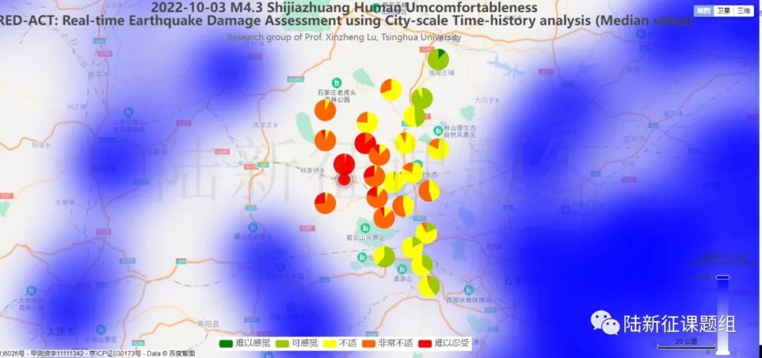 根據(jù)中國地震學(xué)會標(biāo)準(zhǔn)《基于強(qiáng)震動記錄的地震破壞力評估T/SSC 1—2021》(參閱新標(biāo)準(zhǔn)發(fā)布 :基于強(qiáng)震動記錄的地震破壞力評估),利用密布強(qiáng)震臺網(wǎng)在震后獲取的實(shí)時(shí)地震動信息,再結(jié)合城市抗震彈塑性分析,就可以得到地震發(fā)生后不同地點(diǎn)的建筑破壞情況,為抗震救災(zāi)決策提供科學(xué)支撐。圖3為根據(jù)本次地震震中附近范圍內(nèi)臺站記錄分析得到的建筑震害分布示意圖。圖4為根據(jù)本次地震震中附近范圍內(nèi)臺站記錄分析得到的人員加速度感受分布示意圖。