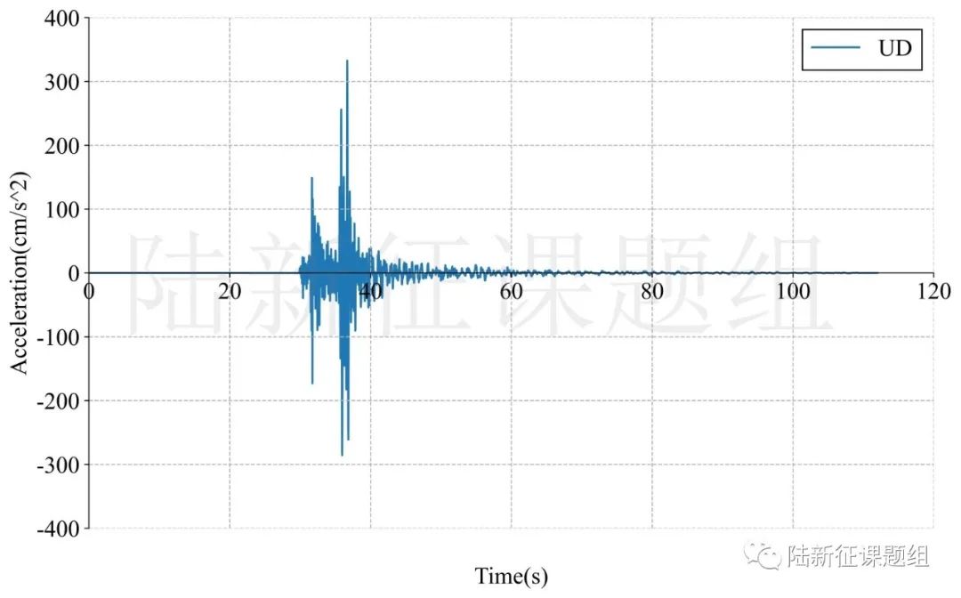 ce89462典型臺站位置北緯40.504度,西經(jīng)124.101度,記錄到水平向地震動峰值加速度為1411cm/s/s,豎直向地震動峰值加速度為333cm/s/s。該地震動及反應(yīng)譜如圖1、圖2所示。