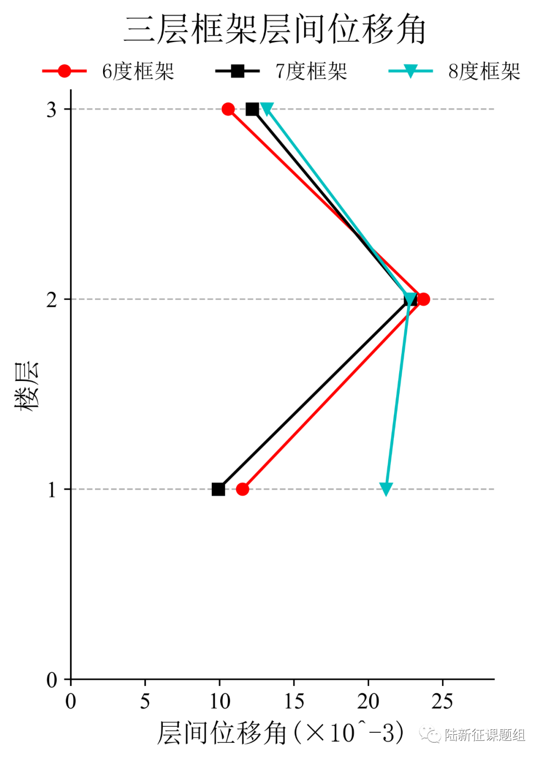 將典型臺站記錄輸入立面布置如圖5(a)所示的6度、7度和8度設(shè)防的典型三層鋼筋混凝土框架結(jié)構(gòu),得到其層間位移角包絡(luò)如圖5(b)所示。