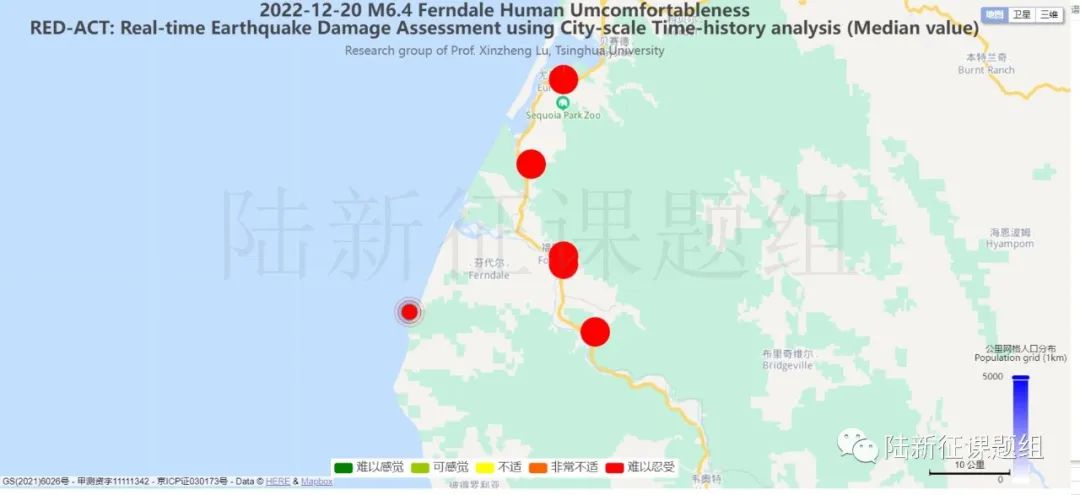 根據(jù)中國地震學(xué)會標(biāo)準(zhǔn)《基于強(qiáng)震動記錄的地震破壞力評估T/SSC 1—2021》(參閱新標(biāo)準(zhǔn)發(fā)布 :基于強(qiáng)震動記錄的地震破壞力評估),利用密布強(qiáng)震臺網(wǎng)在震后獲取的實(shí)時(shí)地震動信息,再結(jié)合城市抗震彈塑性分析,就可以得到地震發(fā)生后不同地點(diǎn)的建筑破壞情況,為抗震救災(zāi)決策提供科學(xué)支撐。圖3為根據(jù)本次地震震中附近范圍內(nèi)臺站記錄分析得到的建筑震害分布示意圖。圖4為根據(jù)本次地震震中附近范圍內(nèi)臺站記錄分析得到的人員加速度感受分布示意圖。
