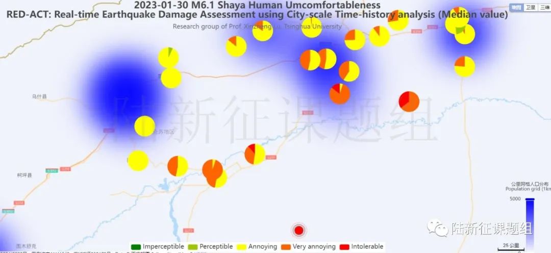根據(jù)中國(guó)地震學(xué)會(huì)標(biāo)準(zhǔn)《基于強(qiáng)震動(dòng)記錄的地震破壞力評(píng)估T/SSC 1—2021》(參閱新標(biāo)準(zhǔn)發(fā)布 :基于強(qiáng)震動(dòng)記錄的地震破壞力評(píng)估),利用密布強(qiáng)震臺(tái)網(wǎng)在震后獲取的實(shí)時(shí)地震動(dòng)信息,再結(jié)合城市抗震彈塑性分析,就可以得到地震發(fā)生后不同地點(diǎn)的建筑破壞情況,為抗震救災(zāi)決策提供科學(xué)支撐。圖3為根據(jù)本次地震震中附近范圍內(nèi)臺(tái)站記錄分析得到的建筑震害分布示意圖。圖4為根據(jù)本次地震震中附近范圍內(nèi)臺(tái)站記錄分析得到的人員加速度感受分布示意圖。