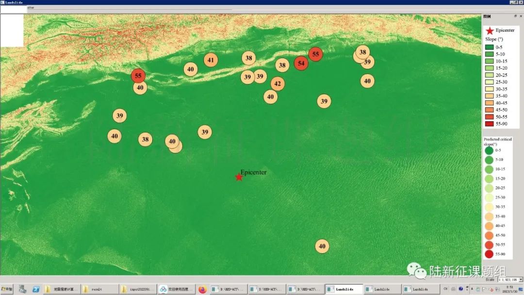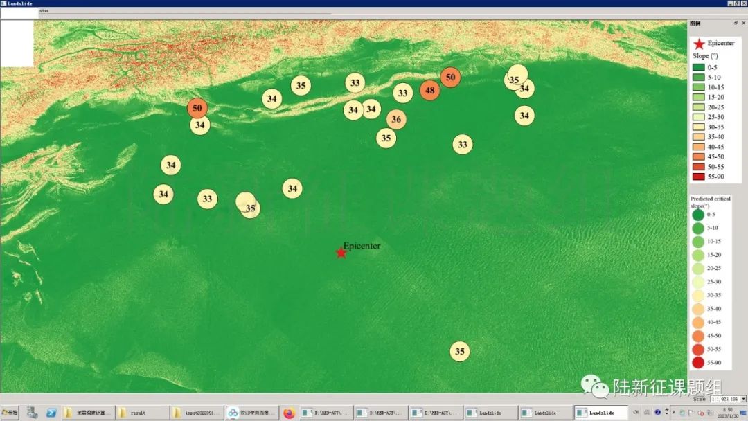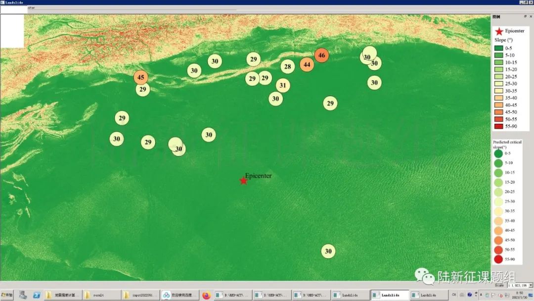 根據(jù)當(dāng)?shù)氐匦螖?shù)據(jù)、巖性數(shù)據(jù)和實(shí)測(cè)地面運(yùn)動(dòng)記錄,可以計(jì)算得到不同滑坡體飽和比例下的滑坡分布,如圖5所示。其中,底圖為當(dāng)?shù)仄露确植紙D,每個(gè)圓圈代表每個(gè)臺(tái)站的計(jì)算結(jié)果,圓圈中的數(shù)字代表發(fā)生滑坡的臨界坡度,臺(tái)站附近坡度大于該數(shù)值的地方滑坡發(fā)生概率高。
