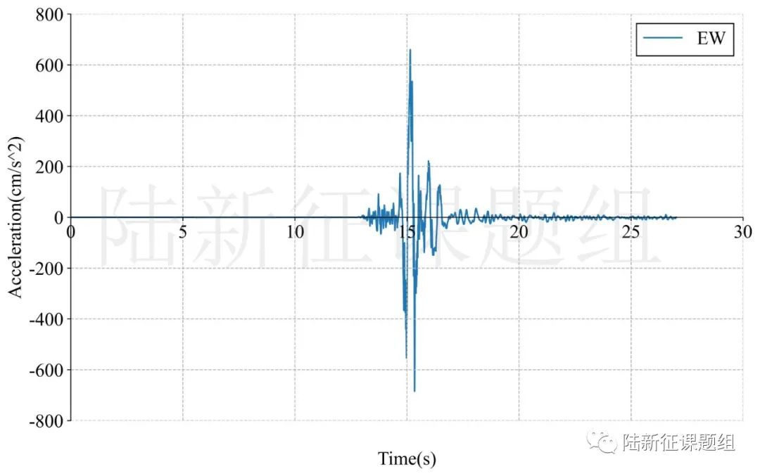 選取圖8所示朱伯龍等開展的五層簡(jiǎn)易砌體結(jié)構(gòu)足尺試驗(yàn)?zāi)P停斎氲湫团_(tái)站記錄,分析結(jié)果表明該結(jié)構(gòu)將處于中度破壞狀態(tài)。(朱伯龍等,上海五層砌塊試驗(yàn)樓抗震能力分析,同濟(jì)大學(xué)學(xué)報(bào),1981,4,7-14.)