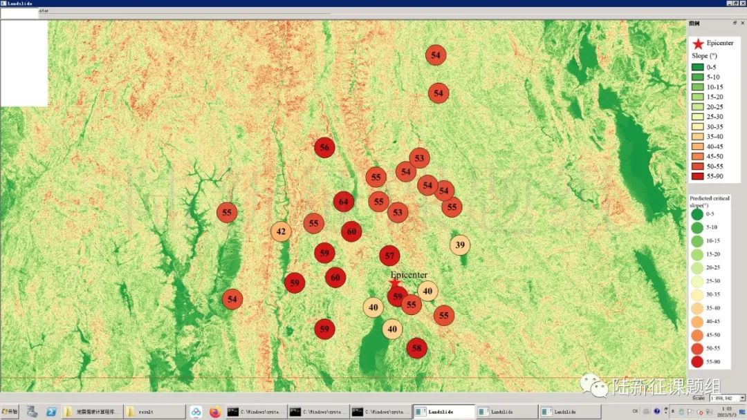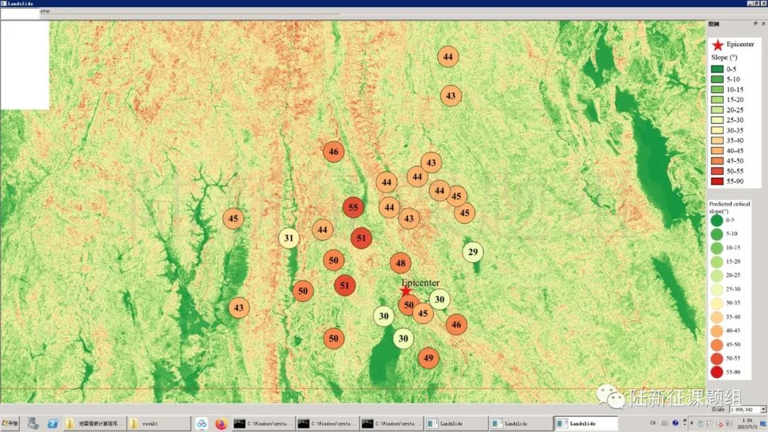 根據(jù)當(dāng)?shù)氐匦螖?shù)據(jù)、巖性數(shù)據(jù)和實(shí)測(cè)地面運(yùn)動(dòng)記錄,可以計(jì)算得到不同滑坡體飽和比例下的滑坡分布,如圖5所示。其中,底圖為當(dāng)?shù)仄露确植紙D,每個(gè)圓圈代表每個(gè)臺(tái)站的計(jì)算結(jié)果,圓圈中的數(shù)字代表發(fā)生滑坡的臨界坡度,臺(tái)站附近坡度大于該數(shù)值的地方滑坡發(fā)生概率高。