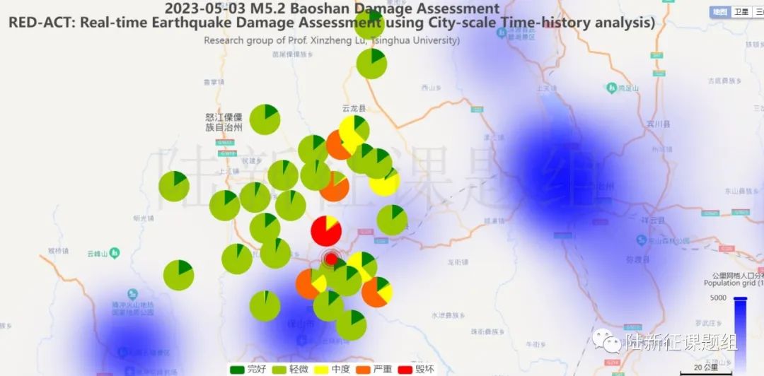 根據(jù)中國地震學(xué)會(huì)標(biāo)準(zhǔn)《基于強(qiáng)震動(dòng)記錄的地震破壞力評(píng)估T/SSC 1—2021》(參閱新標(biāo)準(zhǔn)發(fā)布 :基于強(qiáng)震動(dòng)記錄的地震破壞力評(píng)估),利用密布強(qiáng)震臺(tái)網(wǎng)在震后獲取的實(shí)時(shí)地震動(dòng)信息,再結(jié)合城市抗震彈塑性分析,就可以得到地震發(fā)生后不同地點(diǎn)的建筑破壞情況,為抗震救災(zāi)決策提供科學(xué)支撐。圖3為根據(jù)本次地震震中附近范圍內(nèi)臺(tái)站記錄分析得到的建筑震害分布示意圖。圖4為根據(jù)本次地震震中附近范圍內(nèi)臺(tái)站記錄分析得到的人員加速度感受分布示意圖。