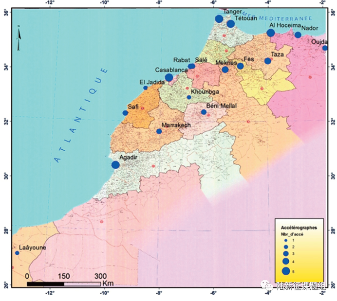 (Cherkaoui & Hassani , 2012)摩洛哥地震威脅最高的地區(qū),50年超越概率10%(即重現(xiàn)期475年)的地面運(yùn)動(dòng)加速度在 0.08 至 0.16 g 之間(圖4),過去曾發(fā)生過Al Hoceima和Agadir等大地震。然而,根據(jù)Birouk等(2020)的研究,摩洛哥的強(qiáng)震臺(tái)網(wǎng)數(shù)量和密度都不太行(圖5、6),這次地震很可能無(wú)法獲得近場(chǎng)的強(qiáng)震記錄。