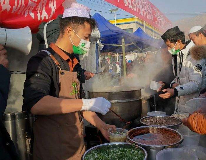 8點(diǎn)多,太陽(yáng)升起,伴著暖洋洋的陽(yáng)光,“頭鍋”開了。馬班吉的伙計(jì)嫻熟地舀起一碗面湯,撒下一把面條,牛肉塊、香菜碎,再加上一勺辣子,第一碗冒著熱氣和香氣的牛肉面遞到村民面前。