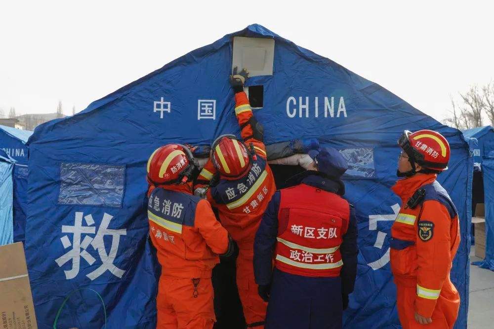 12月19日,在甘肅臨夏積石山縣大河家鎮(zhèn)大河村安置點(diǎn),消防人員在安裝取暖設(shè)備。新華社記者 方欣 攝